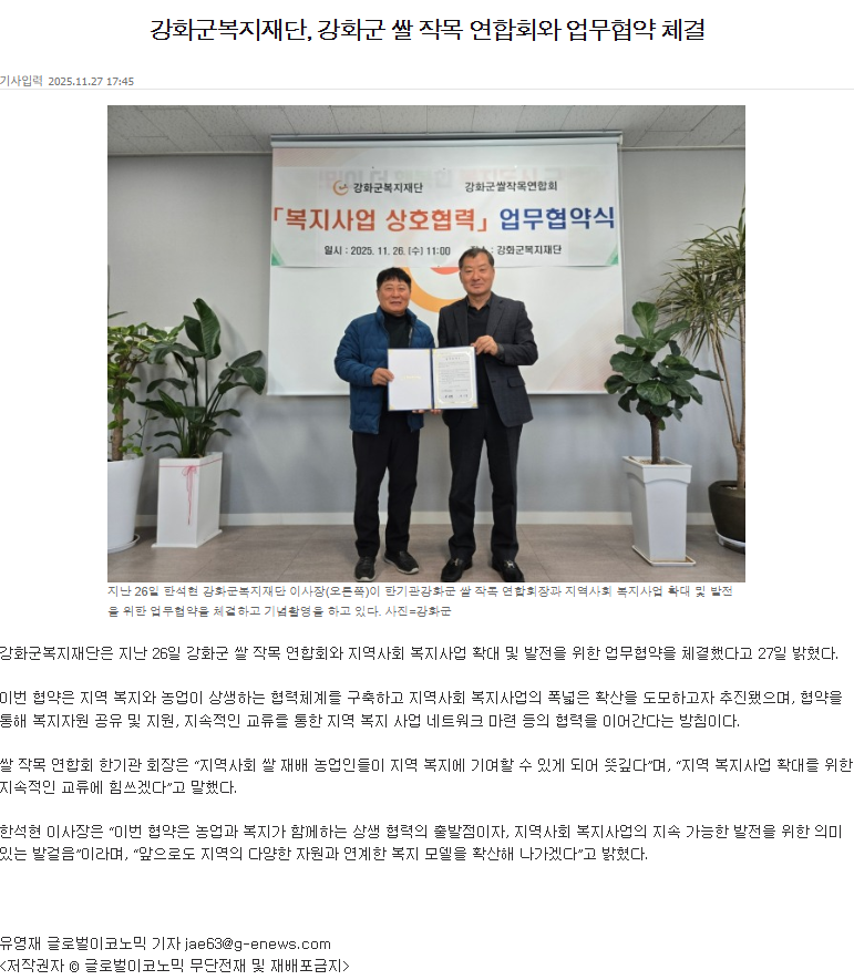 강화군복지재단, 강화군 쌀 작목 연합회와 업무협약 체결