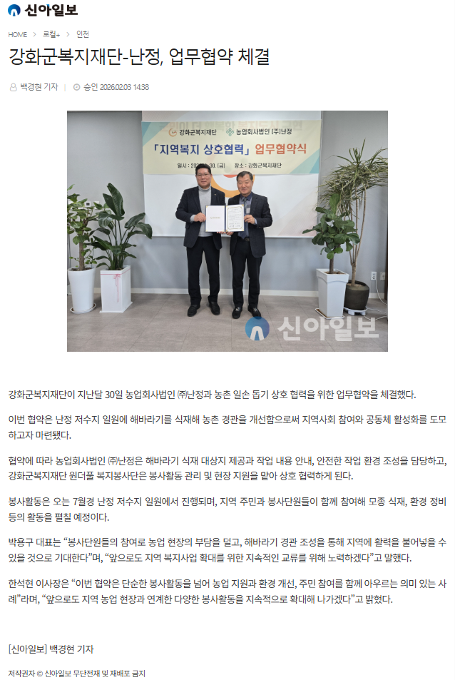 강화군복지재단-난정, 업무협약 체결